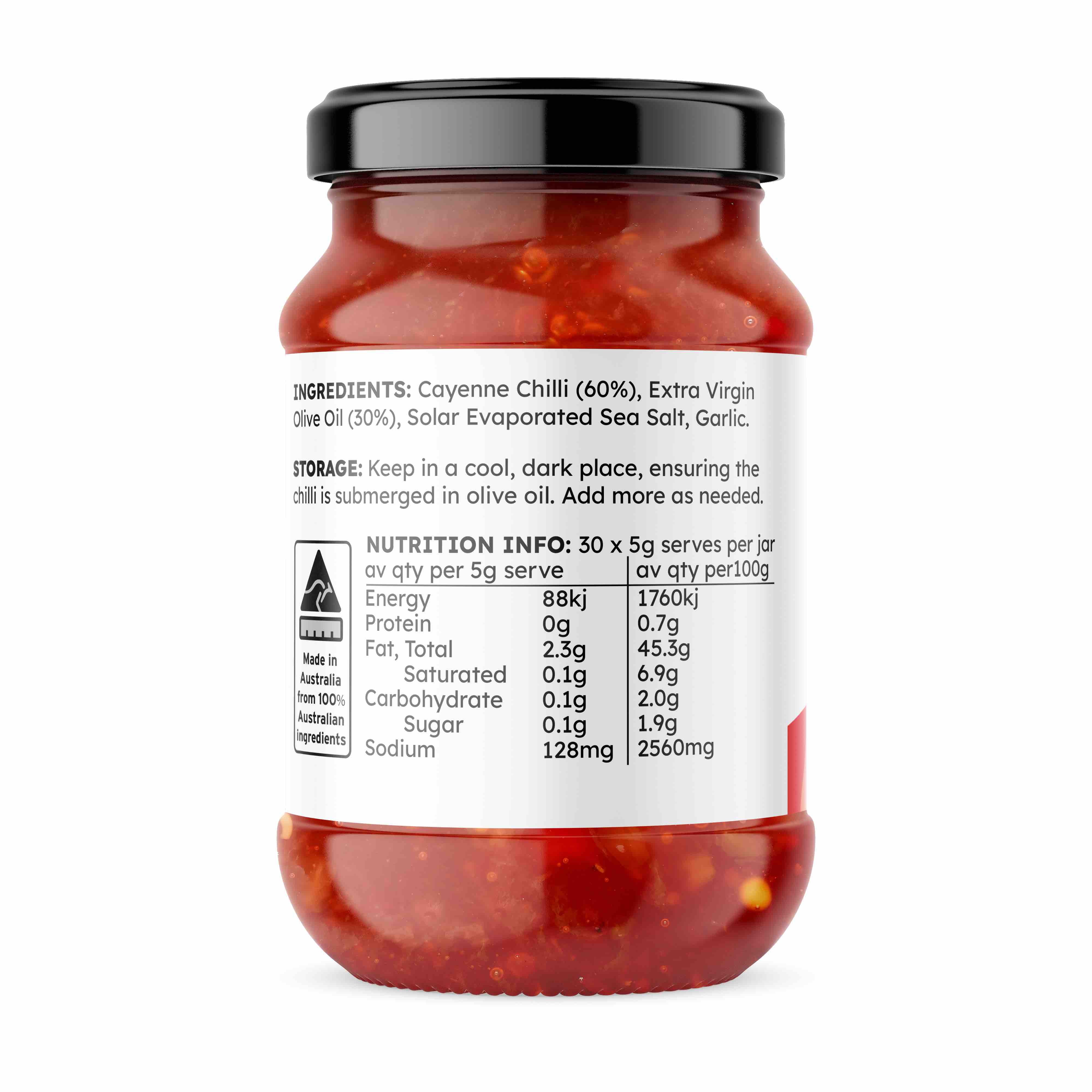 Cayenne chilli (60%), extra virgin olive oil (30%), Sea salt, garlic.