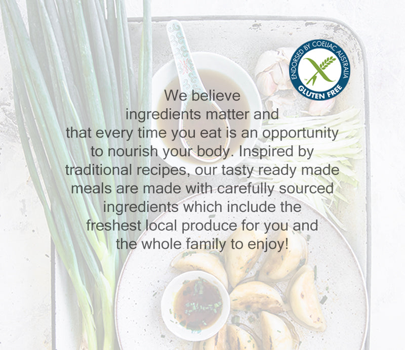 Ingredients (FODMAP Friendly): Free-Range Chicken, Cabbage, Filtered Water, Rice Flour, Shiitake Mushroom, Tapioca Flour, Glutinous Rice Flour, Sunflower Oil, Millet Flour, Xanthan Gum, Ginger, Gluten-Free Soy Sauce, Sea Salt, Potato Starch, Chinese Five Spice, Pepper.
